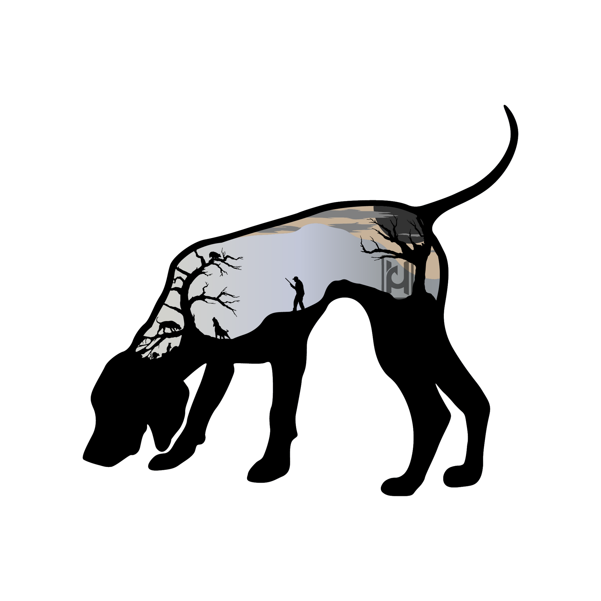 Bluetick Coonhound sticker featuring a mountain scene with a hunter and their dog. Our stickers are UV protected and great on water bottles, coolers, coffee tumblers, etc. Dishwasher safe!