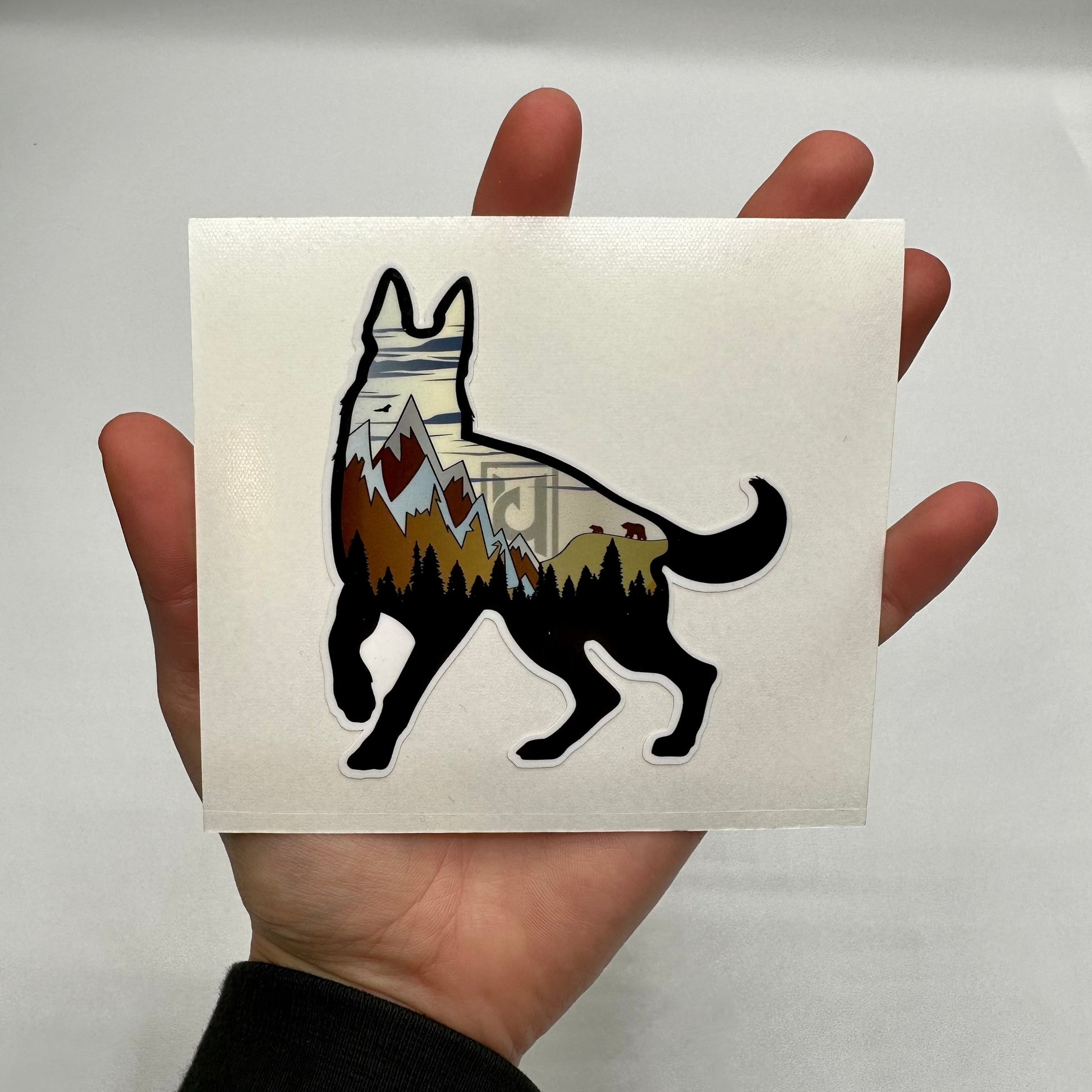 German Shepherd sticker featuring a mountain scene and wildlife. Our stickers are UV protected and look great on water bottles, coolers, coffee tumblers, etc. Dishwasher safe!
