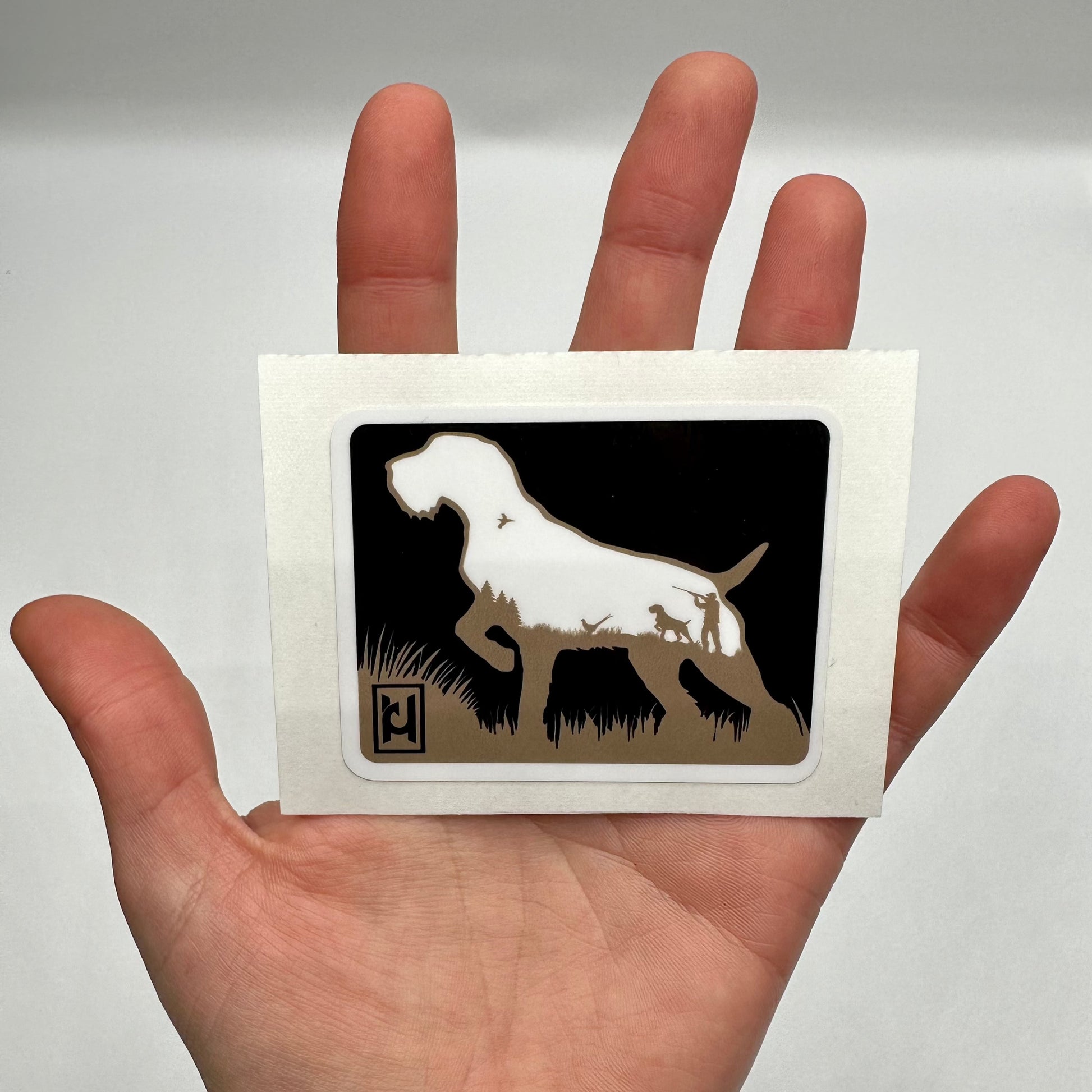 German Wirehaired Pointer sticker featuring a hunting scene with a hunter and their dog. Our stickers are UV protected and look great on water bottles, coolers, coffee tumblers, etc. Dishwasher safe!