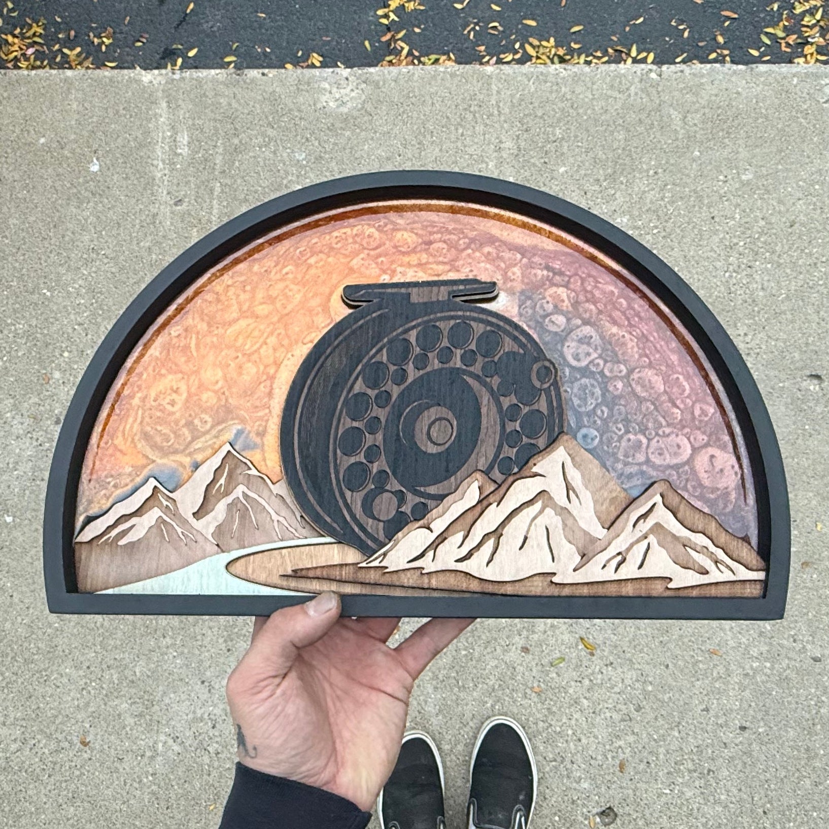 The Keep It REEL Wood Sign showcases an expert design crafted from layered wood, featuring a detailed mountain scape with a fly fishing reel at its center. This piece elegantly combines craftsmanship and nature, making it an ideal way to express your dedication to fly fishing and the outdoors. Its textured layers provide depth, creating a striking tribute to the sport that complements any fishing enthusiast’s space. Be 1 of 5 people to have this 16"x 11" limited edition sign.