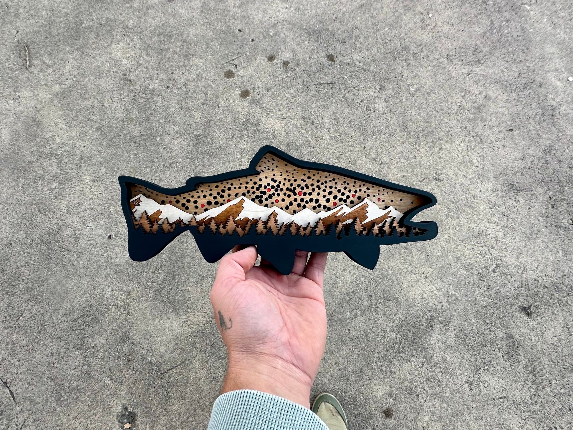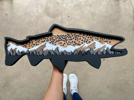This hand-crafted wooden Brown Trout design makes a perfect gift for any self-care enthusiast or avid angler. It has a black border that beautifully complements its dimensional snow-capped mountains and pine trees. The intricate Brown Trout spots and colors create a unique and remarkable item. Hand-stained, painted, and assembled, this piece is one-of-a-kind. It is available in 12", 19" or 24" dimensions.